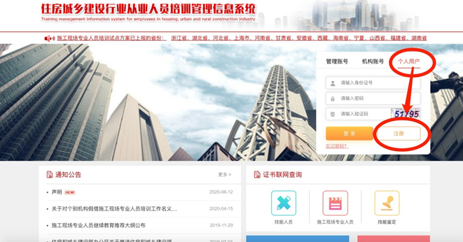 使用電腦打開瀏覽器登錄住房和城鄉(xiāng)建設(shè)行業(yè)從業(yè)人員培訓(xùn)管理信息系統(tǒng)(網(wǎng)址 http://rcgz.mohurd.gov.cn) 進(jìn)行免費(fèi)注冊,須使用市面主流瀏覽器,如谷歌或 360 瀏覽器并調(diào)至極速模式。學(xué)員請選擇個人用戶登錄端口,如圖所示: