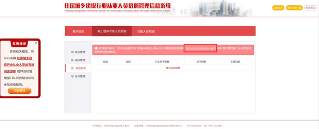 選擇【繼續(xù)教育】標(biāo)簽,點(diǎn)擊住房城鄉(xiāng)建設(shè)行業(yè)從業(yè)人員教育培訓(xùn)資源庫網(wǎng)址進(jìn)入繼續(xù)教育培訓(xùn)網(wǎng)(也可在通過瀏覽器直接輸入http://zyk.etledu.com 打開網(wǎng)站),如圖所示: