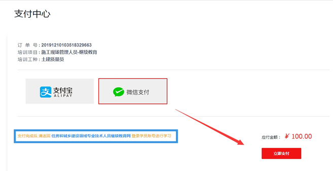 訂單生成后,點(diǎn)擊【立即購買】,頁面將跳轉(zhuǎn)到在線支 付頁面,可選擇【微信】或【支付寶】進(jìn)行支付,在新頁面 掃描支付二維碼完成支付,支付成功后,系統(tǒng)提示將自動返回培訓(xùn)網(wǎng)界面。(推薦使用微信支付)