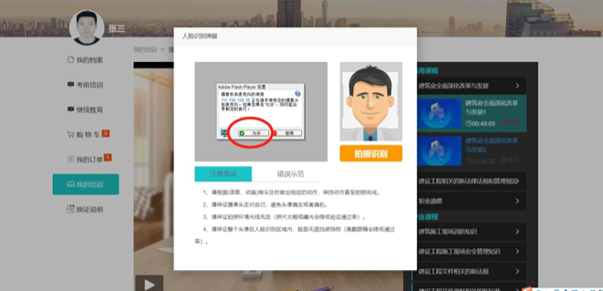 點(diǎn)擊【開始學(xué)習(xí)】后,彈出攝像頭麥克風(fēng)的使用提示,點(diǎn)擊“允許”啟用攝像頭,否則會因?yàn)椴荒茏R別無法進(jìn)入系統(tǒng)。 學(xué)習(xí)時電腦須配備攝像頭,學(xué)習(xí)過程中抓拍照片。