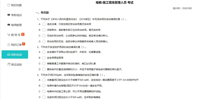 全部學(xué)時學(xué)習(xí)完成后,可進(jìn)入在線考核環(huán)節(jié),題目共 50 道,滿分 100 分,60 分(含)以上為合格。考核未通過的, 可繼續(xù)考核測試,直至合格為止,考核未通過不影響學(xué)時累計(jì)。